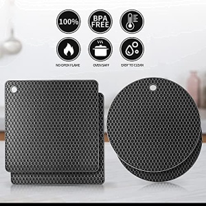 Ultra high temperature heat resistance:Heat resistant temperature up to 464°F,Can withstand extreme temperatures from -30°C to 240°C (-22°F to 464°F) without harm. High-quality materials:100% food-grade silicone. They are durable and flexible, without getting dirty, moldy, or absorbing odors. Exquisite set and size:2 square honeycomb silicone tripods. 2 round honeycomb silicone tripods.Size is at 7.28 x 7.28 x 0.25 inches.