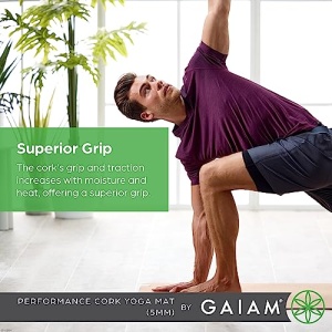 Details: Gaiam cork yoga mat features an all-natural, sustainable cork on the top, and a non-toxic, lightweight TPE rubber on the bottom for a premium yoga mat. Cork resists moisture and will not absorb any funky smell or odor. However, as temperatures rise and the cork begins to loosen it will become softer and easier to grip when slightly damp.