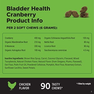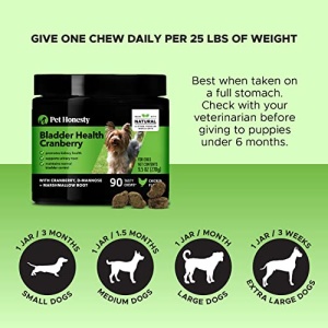 Details: PetHonesty Cranberry Supplement Dog Treat Chews – harsh preservative Free Soft Chews for Dogs UTI, Bladder Infection, Urinary Tract Health, UT Incontinence, Immune System – Cranberry, D-Mannose- Made in USA – 90 count PetHonesty Nutrition’s Cranberry Bladder Strength Chews are a powerful dietary supplement for your dog that helps support urinary and bladder health. These chews help minimize UTIs and bladder infections and keep normal pH levels and optimal bladder function. Cranberry – Strengthens the immune system to prevent infection and maintains the lining of the urinary tract D-Mannose – Quickly and safely expels bad bacteria out of your dog’s system to treat UTIs Echinacea – Helps boost immune system and fight germs Marshmallow Root – Another immune system booster that keeps the urinary tract healthy